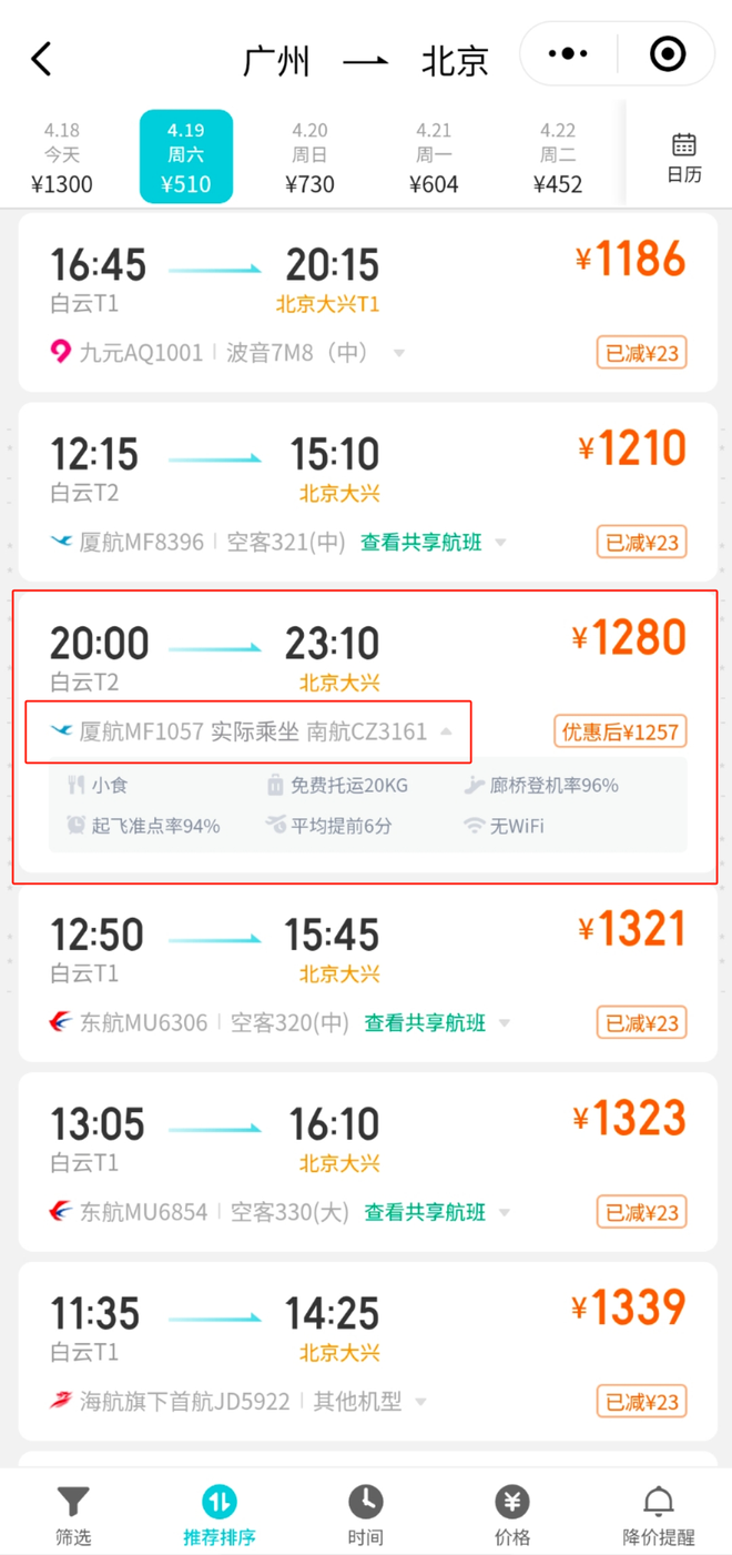 以广州至北京的航线为例,南方航空开设了多班南航快线,但在“去哪儿”搜索广州至北京的航班,搜索结果中没有南方航空的航班,只有相关的共享航班(如由厦门航空出票、实际由南方航空承运)。