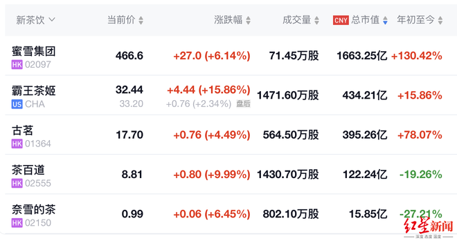 近年上市的中国新茶饮企业市值排名 图源:雪球