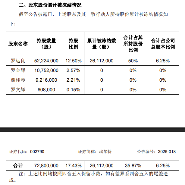 据瑞尔特披露,目前,罗远良持有瑞尔特5222.40万股股票,持股比例约为12.5%。此次,罗远良共有2611.2万股股票遭到冻结,占其所持股份的50%,占总股本的6.25%。