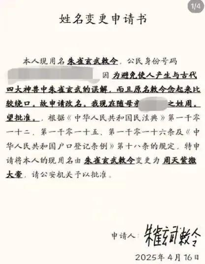 近日,有网友发帖称,自己现用名为“朱雀玄武敕令”,因该名易引发误解且拗口,申请随母姓并更名为“周天紫微大帝”,其公布了身... 近日,有网友发帖称,自己现用名为“朱雀玄武敕令”,因该名易引发误解且拗口,申请随母姓并更名为“周天紫微大帝”,其公布了身份证及姓名变更申请书,引发热议。