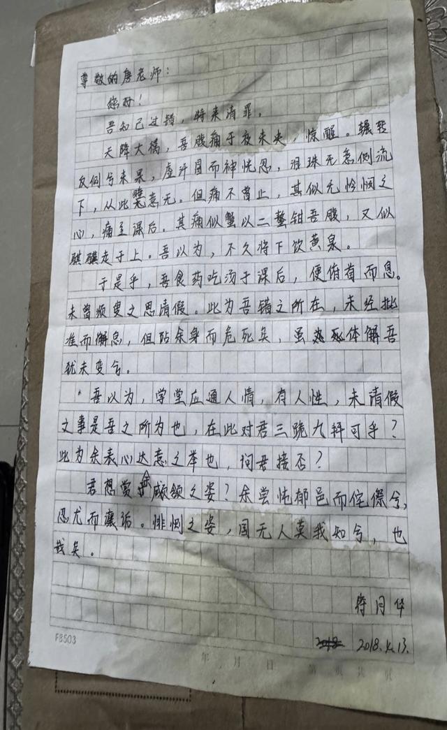 她们先在符晞一堆书籍里发现了一封检讨书。刚开始,她们只在感叹妹妹的字迹很漂亮,结果农淳钰仔细一读,上面写着2018年4月,妹妹对高中班主任“唐老师”的道歉:自己未经批准私自请假,特此公开“请罪”。