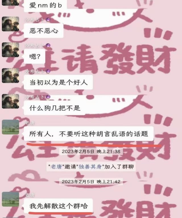 后来,两人找到符晞的高中同学,把符晞拉进那一届的班级群。符晞在其中发送了多条对于唐某某的辱骂。20多分钟后,群聊被唐某某解散。