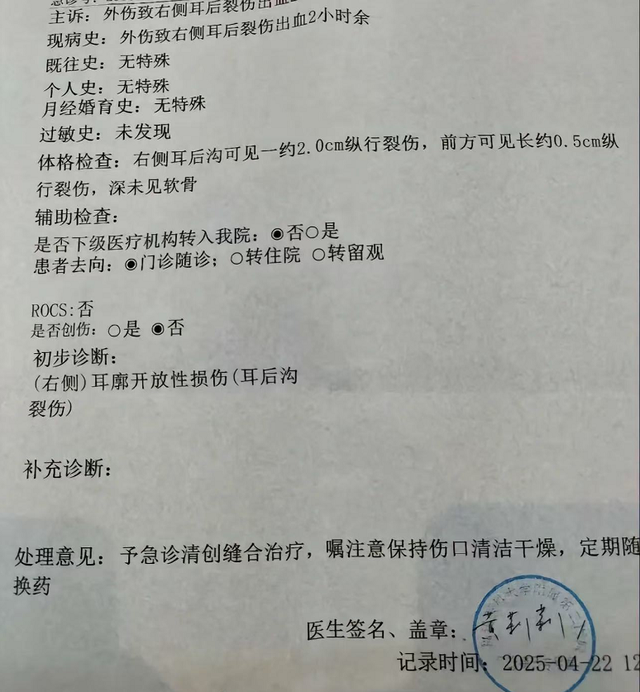 4月22日医院出具随诊检查记录显示,右侧耳后沟可见一约2.0厘米纵行裂伤,前方可见长约0.5厘米纵行裂伤,深未见软骨。初步诊断系右侧耳廓开放性损伤(耳后沟裂伤),进行急诊清创缝合治疗。