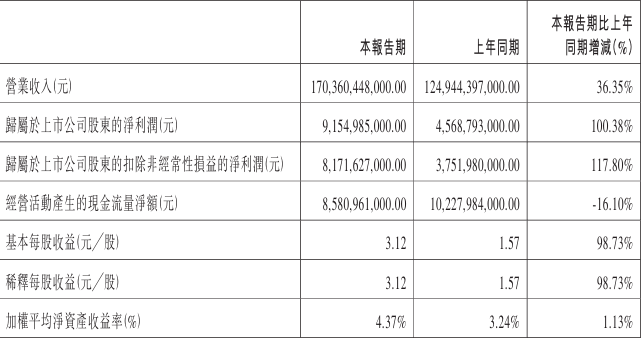 红星资本局4月25日消息,今日晚间,比亚迪(002594.SZ/01211.HK)披露了2025年一季报,公司实现营业收... 红星资本局4月25日消息,今日晚间,比亚迪(002594.SZ/01211.HK)披露了2025年一季报,公司实现营业收入1703.6亿元,同比增长36.35%;归属上市公司股东的净利润为91.55亿元,同比增长100.38%;扣非净利润为81.7亿元,同比增长117.8%;基本每股收益3.12元/股,同比增长98.73%。