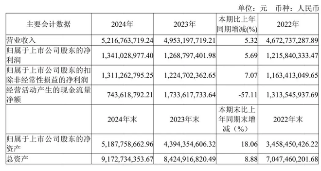 年报显示,2024年,水井坊实现营业收入52.17亿元,同比增长5.32%;实现归属于上市公司股东的净利润13.41亿元,同比增长5.69%;基本每股收益2.76元。公司拟向全体股东每10股派发现金红利9.70元(含税),合计拟派发现金红利4.70亿元(含税)。