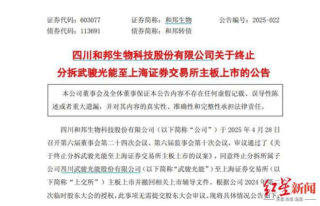 微成都报道4月28日晚间,和邦生物(603077.SH)披露公告称,公司决定终止分拆所属子公司四川武骏光能股份有限公司(... 微成都报道4月28日晚间,和邦生物(603077.SH)披露公告称,公司决定终止分拆所属子公司四川武骏光能股份有限公司(以下简称“武骏光能”)至上交所主板上市。