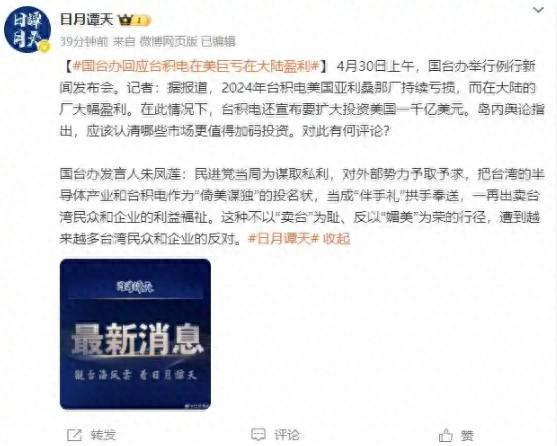 4月30日上午,国台办举行例行新闻发布会。记者:据报道,2024年台积电美国亚利桑那厂持续亏损,而在大陆的厂大幅盈利。在... 4月30日上午,国台办举行例行新闻发布会。