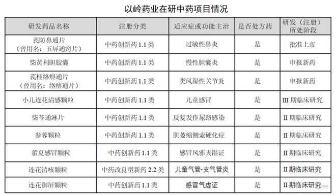 目前,以岭药业围绕中药品种研发,已获临床批件品种涉及风湿免疫系统、消化系统、五官科及儿科等疾病,在研立项品种涵盖心血管系统、呼吸系统、内分泌代谢系统、神经系统、消化系统、妇科、儿科等疾病,分别处于新药研发不同阶段。其中,柴黄利胆胶囊、芪桂络痹通片注册申请已获正式受理;小儿连花清感颗粒处于三期临床,柴芩通淋片、连花清咳颗粒等五款药物处于二期临床。