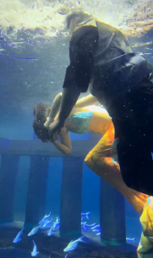 4月25日14:55,有网友发视频反映山西太原市同至人购物中心内海洋大世界“美人鱼”表演时,女演员在大约2米深的水下失去意识。