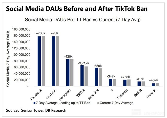 结合 Sensor Tower 数据,在 1 月的 TikTok ban 前后,Meta 旗下的 FB、IG 以及新平台 Threads,均有流量增长。尤其是早就老态龙钟的 Facebook,前后日活也净增了 75 万人,体现的就是用户寻找替代品的需求。