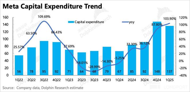 一季度资本开支达到 137 亿,Meta 此次将全年资本开支范围增加至 640-720 亿美元区间,相比此前提出的指引 600-650 亿,有明显增幅。