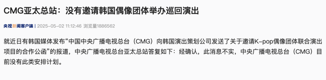 央视辟谣:未邀请韩国偶像团体联合演出,消息不实! 访客 2025-05-02 15:04:41 115 默认 摘要: 5月2日,据央视新闻消息,就近日有韩国媒体发布“中国中央广播电视总台(CMG)向韩国演出策划公司发送了关于邀请K-pop... 5月2日,据央视新闻消息,就近日有韩国媒体发布“中国中央广播电视总台(CMG)向韩国演出策划公司发送了关于邀请K-pop偶像团体联合演出项目的合作公函”的报道,中央广播电视总台亚太总站答复如下:经确认,此消息不实,中央广播电视总台(CMG)目前没有此类安排计划。来源 | 央视新闻监制 | 李金锋 李洁敏主编 | 彭丹编辑 | 魏娜 标签: 总台 广播电视 海报 阅读 QQ 分享 微博分享 微信分享 分享 上一篇五一防骗指南来了:免费Wi-Fi别乱连 低价票勿轻信 下一篇2025年五一档新片票房破3亿 五一防骗指南来了:免费Wi-Fi别乱连 低价票勿轻信上一篇 2025年五一档新片票房破3亿下一篇 相关推荐 总台广播电视 大妈解手,愣说被一大爷看到,定要索赔20元,大爷:真没看清 2025-11-10 《声鸣远扬2025》总决赛:那英质疑票数差异太大,何炅“囧”了! 2025-11-10 孟村女子遭丈夫家暴致死案新进展:两人被公诉!3岁孩子下落不明 2025-11-09 海口一教师涉嫌强奸10岁女孩!事发5年后被逮捕,教师坚决否认 2025-11-09 两名女孩将邻居家婴儿杀死,其残忍程度令人发指!警方:不予立案 2025-11-09 老人不“听话”就用剪刀扎!一托老所里的暴行曝出,令人发指 2025-11-09 网购一块电池,导致15死44伤!南京“2·23”火灾事故首次披露 2025-11-09 官宣“福建舰入列”,海军迈入“三航母时代”!现在能硬刚美军吗 2025-11-08
