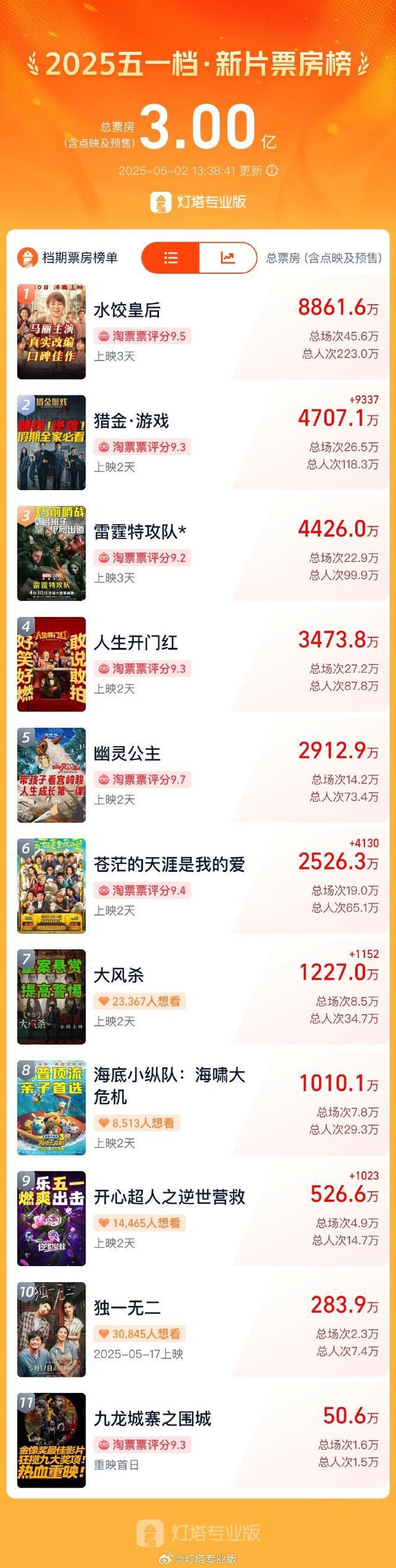 据灯塔专业版,截至5月2日13时38分,2025年五一档新片(含重映)总票房(含点映及预售)突破3亿,影片《水饺皇后》《... 据灯塔专业版,截至5月2日13时38分,2025年五一档新片(含重映)总票房(含点映及预售)突破3亿,影片《水饺皇后》《猎金·游戏》《雷霆特攻队*》《人生开门红》《幽灵公主》《苍茫的天涯是我的爱》暂列前六。