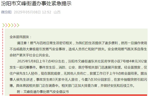 记者注意到,5月8日下午,文峰街道办通过“微汾阳”发布燃气安全倡议书称,8日上午7点40分左右,汾阳市文峰街道东关社区府学苑小区3楼一住户家发生闪爆事件,消防、公安、医疗等相关部门迅速展开救援。经全面搜救,仅住户侯先生一人轻伤,现在医院观察,无其他人员伤亡,救援工作已于上午9点前全面结束。