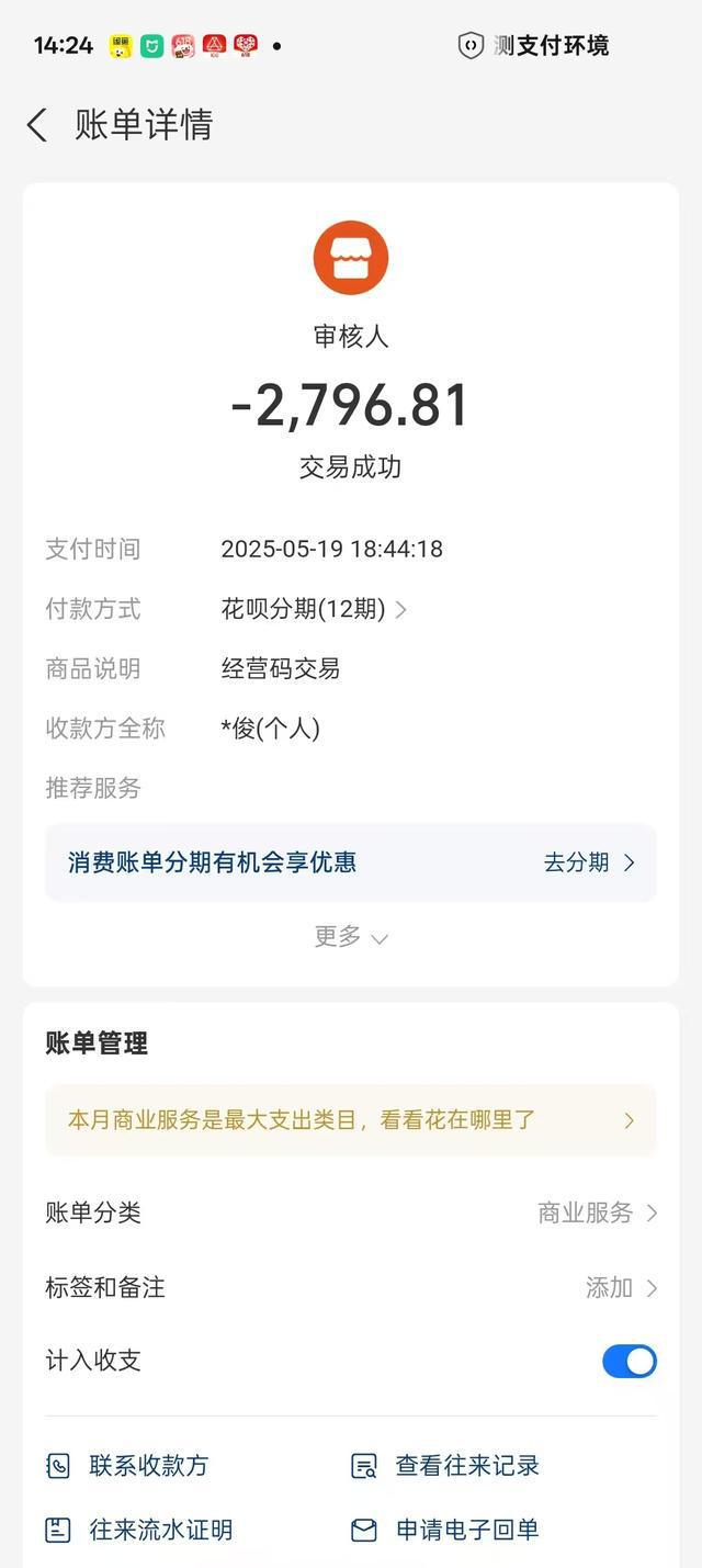 陈女士赶忙打开支付宝,发现18点44分确实有一笔2796.81元的交易成功记录,付款方式正是花呗分期12期。