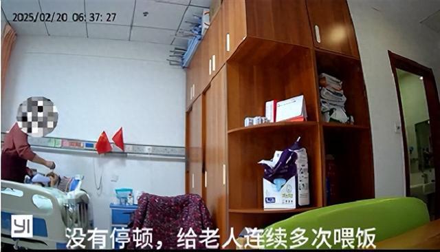 “老人的脸是往上仰着的,基本上没坐起来,老人当时也没有完全清醒,男护工就开始喂饭了,他给老人喂食的就是那种流食糊糊。”亲属提供的监控视频还原事发经过: