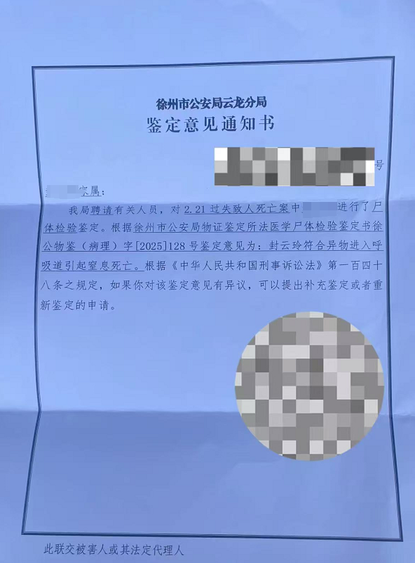 亲属提供的徐州市公安局云龙分局《鉴定意见通知书》显示,我局聘请有关人员对过失致人死亡案中封老太进行了尸体检验鉴定,根据徐州市公安局物证鉴定所法医学尸检鉴定书,鉴定意见为:符合异物进入呼吸道引起窒息死亡。