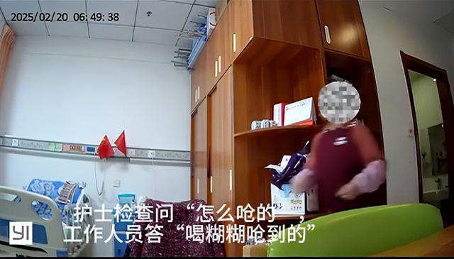 6:49:34,有人检查后询问:“是怎么呛的?”有工作人员回应称:“喝糊糊呛到了。”