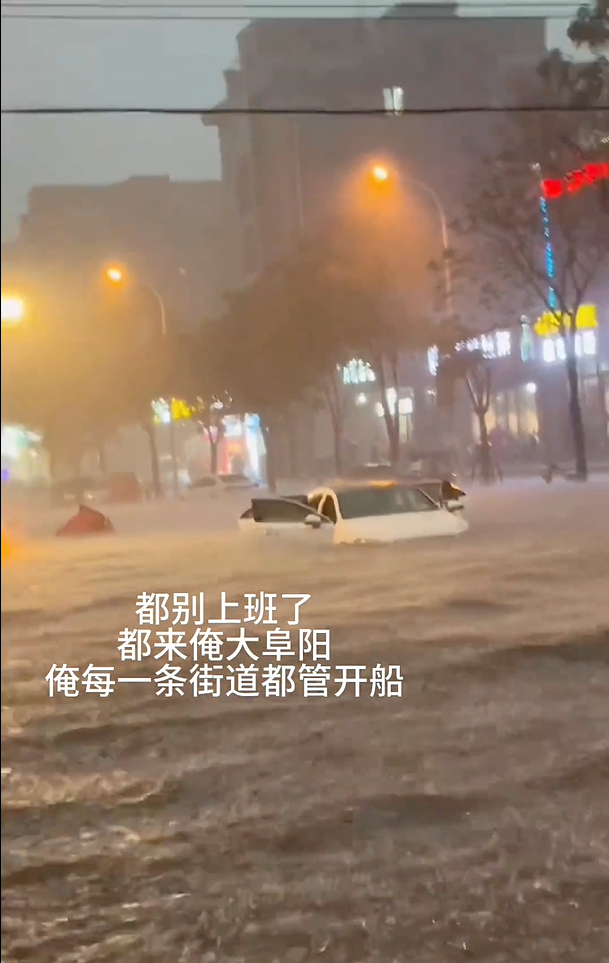 有驾车一族在街面积水里开车,如“逆水行舟”——视频画面显示,积水已经淹到前风挡玻璃,两只雨刷像是“船桨”在划动。发视频的网友解嘲说:“在阜阳开上船了,吓得我当时都失语了,最终安全到家。”