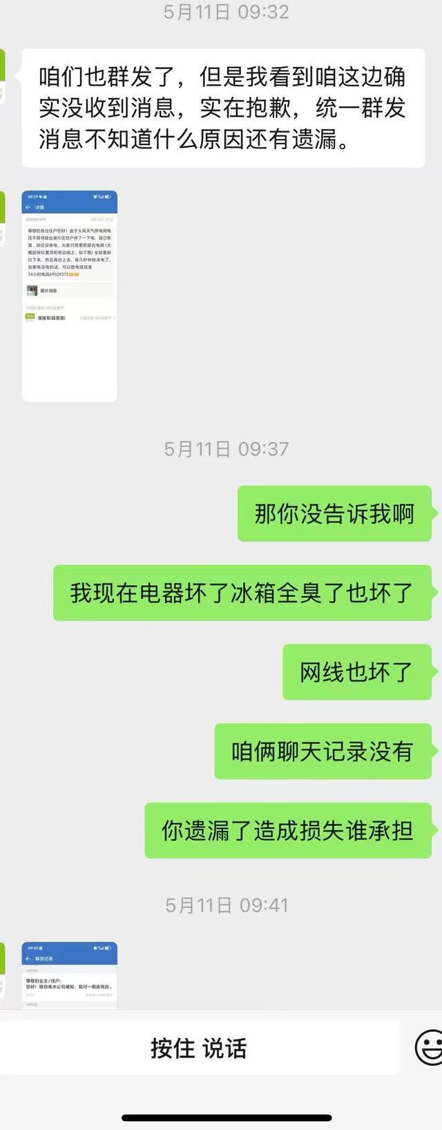 张女士向记者出示了她和物业管家就此事维权的聊天记录,其中物业管家称当天确实通过系统向业主群发了消息,但为何张女士没有收到,她也不清楚。