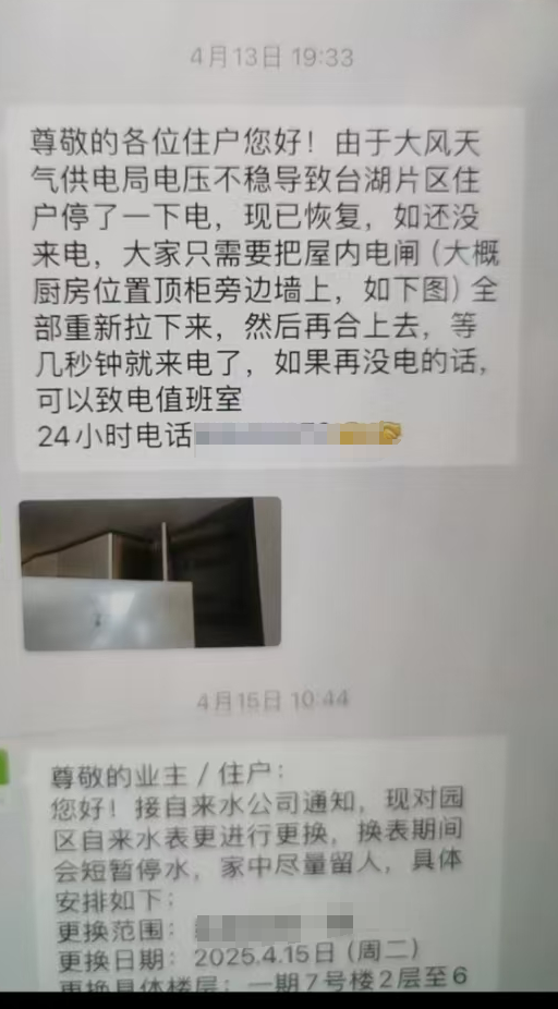 第二天,张女士从邻居那里了解到,4月13日小区因北京大风天气临时断电,物业在业主群里发了消息:“尊敬的各位住户您好!由于大风天气,供电局电压不稳,导致台湖片区住户停了一下电,现已恢复。如还没来电,大家只需要把屋内电闸(大概在厨房位置顶柜旁边墙上,如下图)全部重新拉下来,然后再合上去,等几秒钟就来电了。如果还是没电,可以致电值班室24小时电话。”