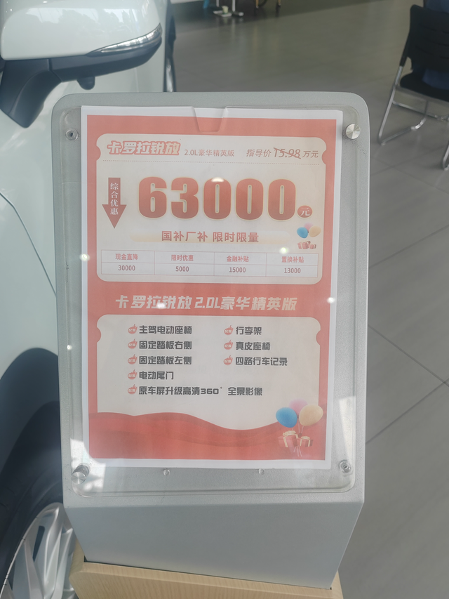 随后,这名负责人向记者出示了4S店内场展示牌,何先生同款车型的展示牌上写着卡罗拉锐放2.0L豪华精英版,指导价15.98万元,综合优惠63000元,包含真皮电动座椅、行李架、踏板、电尾门、行车记录仪、360°影像等内饰升级项目。