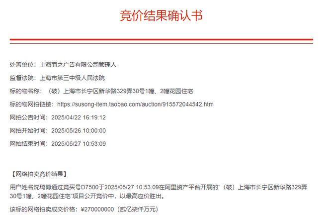 经过19轮竞价,最终,用户姓名沈琦博通过竞买号D7500在拍卖中以最高应价胜出,成交价格为2.7亿元,较起拍价溢价2000万元。