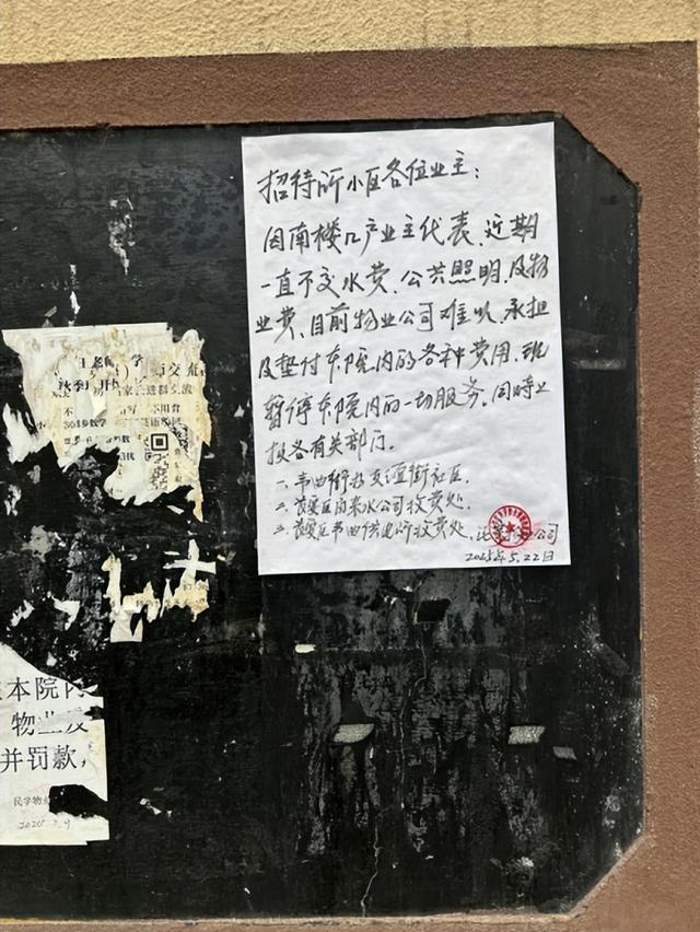 记者看到,这份手写的公告称,“因南楼几户业主代表近期一直不交水费、公共照明及物业费,目前物业公司难以承担及垫付本院内的各种费用,现暂停本院内的一切服务。同时上报各有关部门。”
