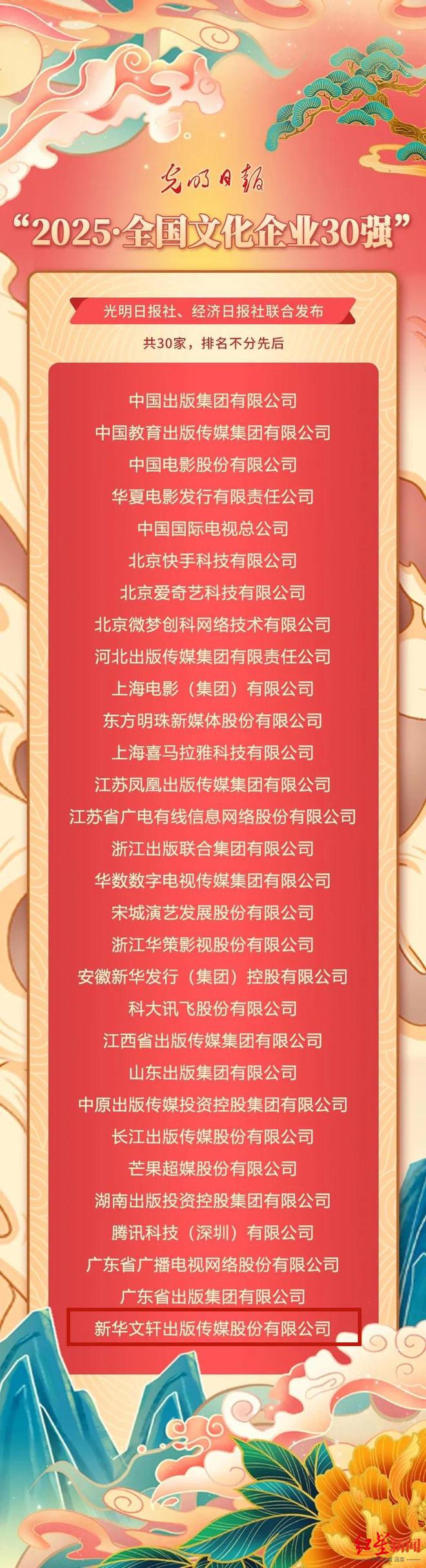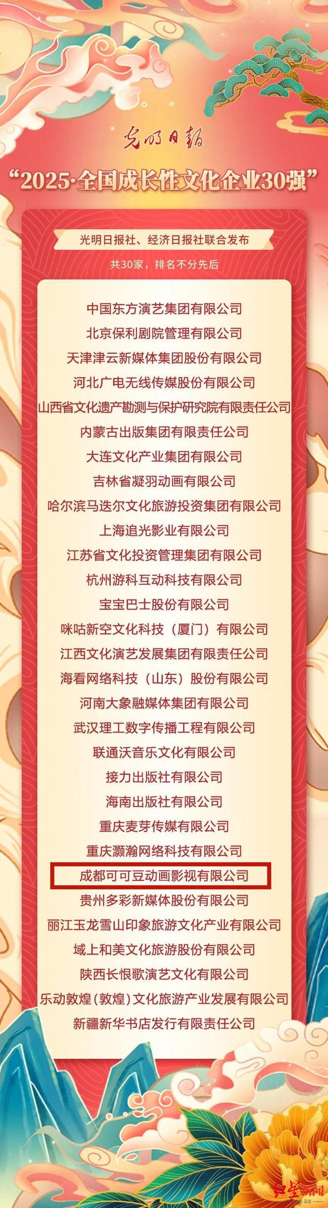 微成都报道5月26日,光明日报社和经济日报社联合向社会发布“2025·全国文化企业30强”名单,并发布“2025·全国成长性文化企业30强”名单。