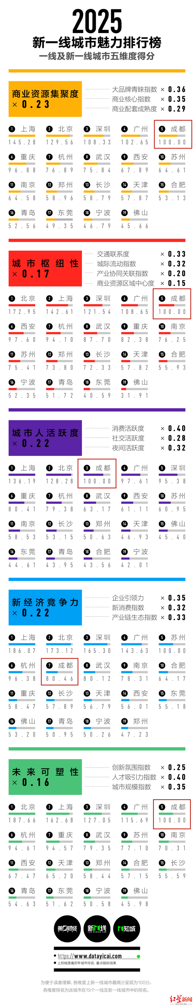 根据今年一线及新一线城市五维度得分,成都在商业资源聚集度、城市枢纽性、城市人活跃度、未来可塑性4个维度均获得了100分。