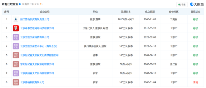 天眼查App显示,李亚鹏名下关联8家企业,其中7家为存续状态,包括丽江雪山投资有限责任公司、北京中书艺莲网络科技有限公司、东阳世纪春天影视策划有限公司等。除上述公司外,李亚鹏还担任北京市朝阳区嫣然天使儿童医院法定代表人。天眼风险信息显示,目前,李亚鹏已于2023年10月被北京市朝阳区人民法院限制高消费。