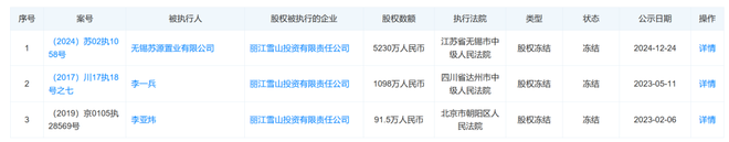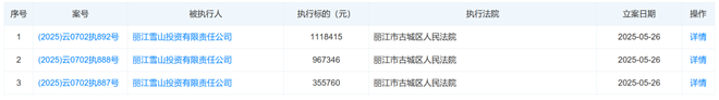 5月27日,公开资料显示,近日,丽江雪山投资有限责任公司新增3条被执行人信息,被执行总金额约244万元,执行法院均为丽江... 5月27日,公开资料显示,近日,丽江雪山投资有限责任公司新增3条被执行人信息,被执行总金额约244万元,执行法院均为丽江市古城区人民法院。