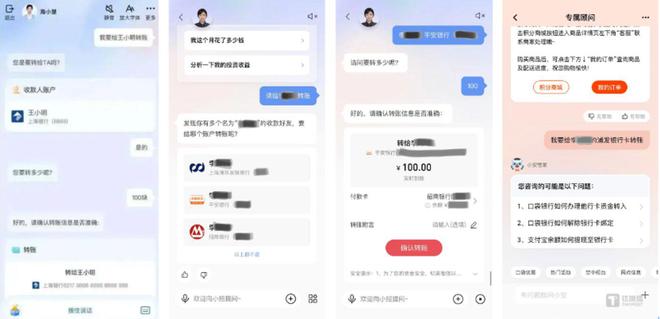 以上海银行、平安银行以及招商银行为例(下图依次是:上海银行、招商银行、平安银行),当用户需要给他人账户进行转账或者一些银行卡基础作用时,只需要输入或者语音说明“我要给XXX转账”,上海银行以及招商银行的智能客服就可以在历史转账中定位出这个人的全部账户信息,再进一步询问确认所需转账的账户信息以及转账金额,并进一步生成转账服务,而平安银行并无法识别这种指令。