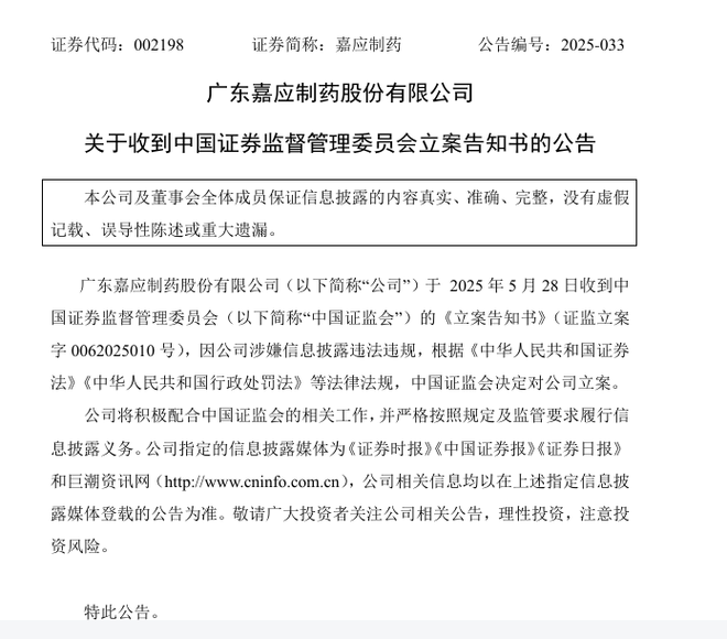 嘉应制药表示,公司将积极配合中国证监会的相关工作,并严格按照规定及监管要求履行信息披露义务。