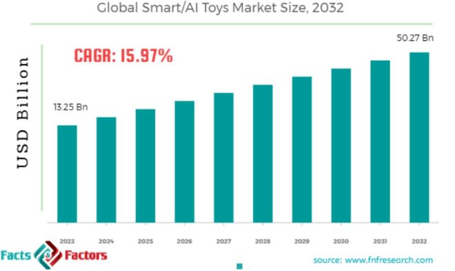 如今,AI玩具市场已热闹非凡,吸引着各方目光。据Facts Factors发布的数据,2023年全球AI玩具市场规模已经达到132.5亿美元,这一数字到2032年有望超过502.7亿美元将超过300亿元,预计2024年至2032年期间复合年增长率为15.97%。