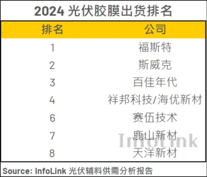 近日,咨询机构Infolink公布了2024年全球光伏胶膜出货排行榜。百佳年代以“黑马”之姿,跃升至全球第三位,出货量也同比增长了27%。
