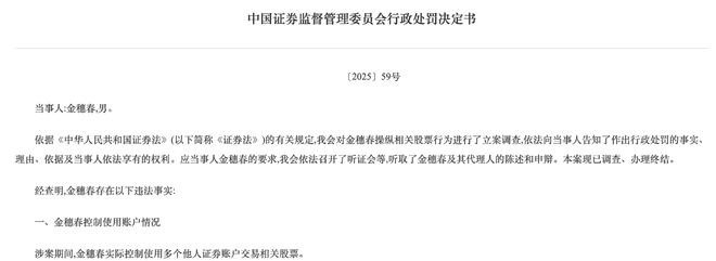 控制多个他人账户操纵股票,金穗春被证监会罚没1.06亿元,并处5年证券市场禁入
