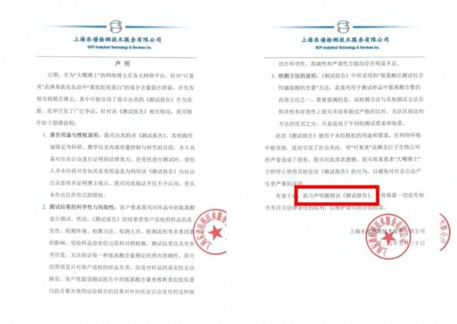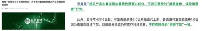 6月4日,巨子生物发文披露多家权威检测机构数据,表示可复美胶原棒1.0和2.0的重组胶原蛋白含量均大于0.1%,不存在网传的「虚假宣传」行为。