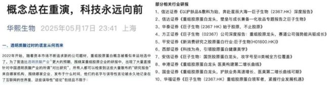 5月17日,华熙生物在官方公众号发文炮轰多家券商机构,认为它们发布的吹捧重组胶原蛋白、唱衰玻尿酸的研报,是在误导市场。