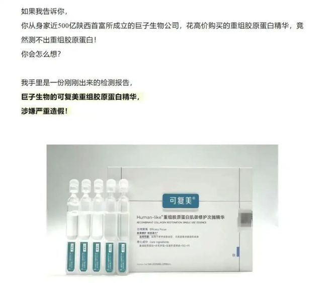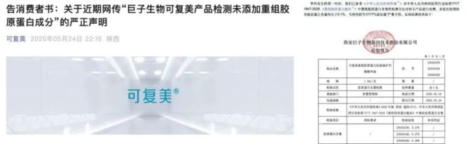5月24日,美妆博主郝宇发布第三方检测报告,质疑巨子生物旗下可复美「胶原棒」产品中重组胶原蛋白含量仅为0.0177%,远低于标注的0.1%,涉嫌严重造假。