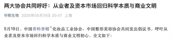 5月19日,中国整形美容协会、中国香料香精化妆品工业协会共同发文,呼吁全行业从业者及资本市场「共同构建健康、理性、可持续的行业生态」。华熙生物官方微信公众号随之转发。