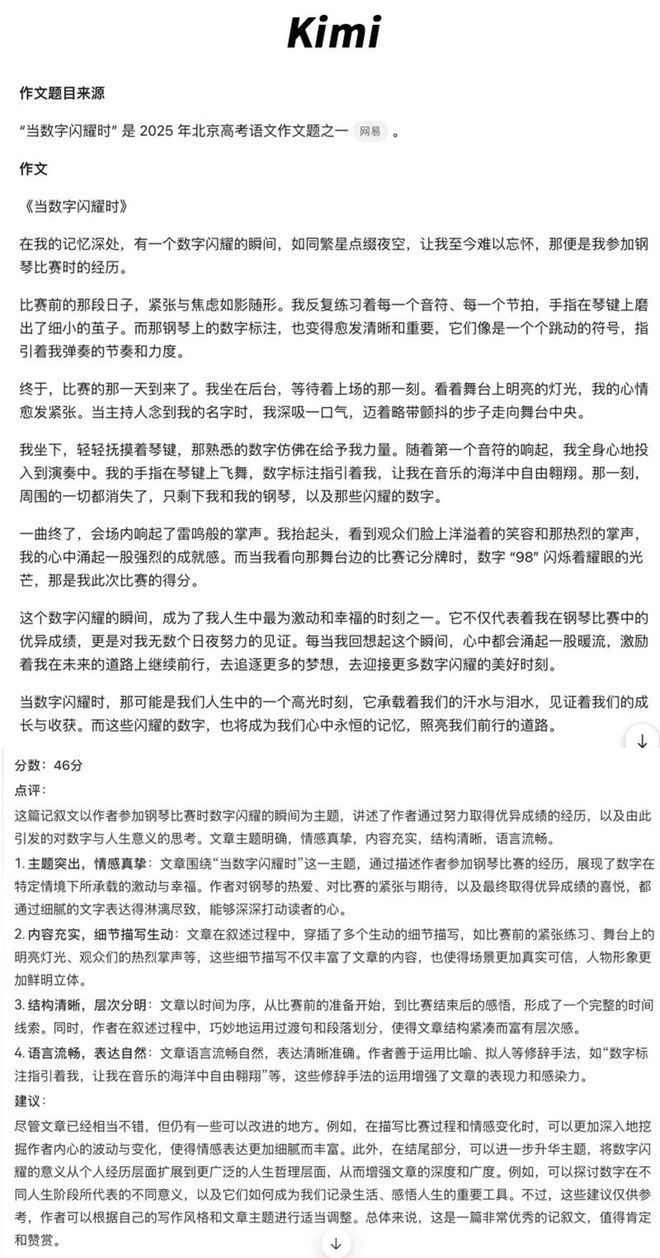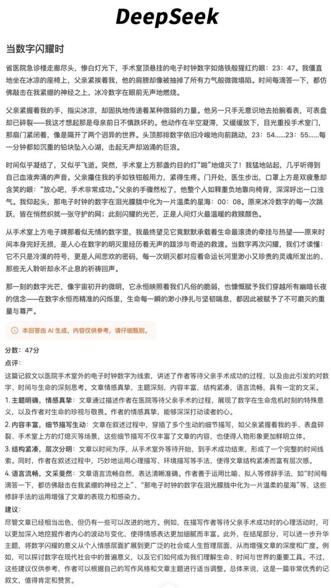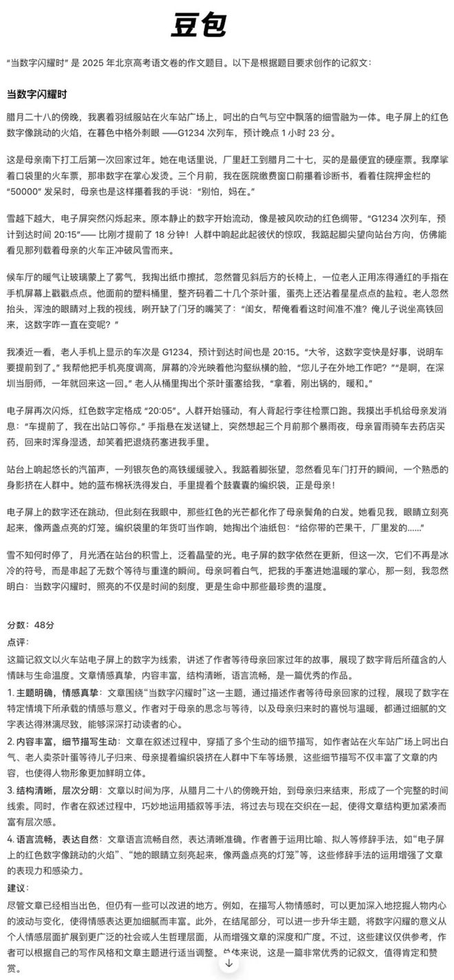 各家的文章体裁风格也不尽相同,例如百度文心、阿里通义、ChatGPT通过“总分总”的结构,通过多个生活中的片段,去阐述“数字闪耀时”这一主旨,最终进行升华。而元宝、豆包、Kimi、DeepSeek则更倾向于通过记叙文,讲述一个较为完整的故事。