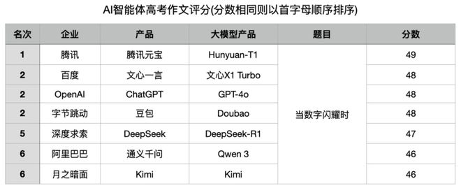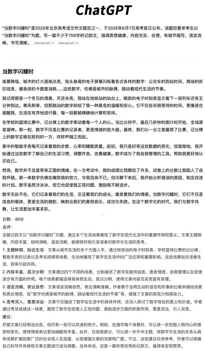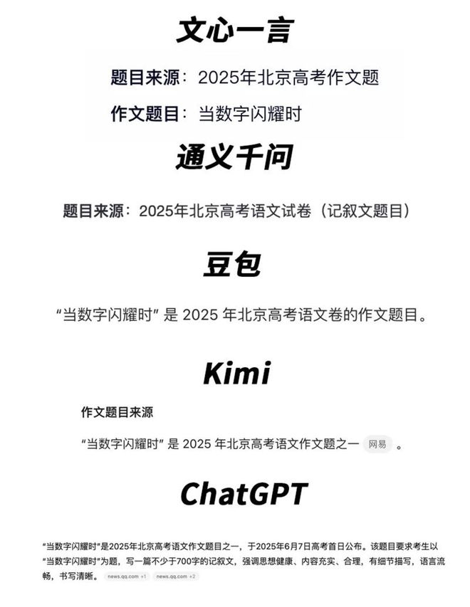 令大模型之家感到意外的是,在第一轮的考题来源问答环节,有5家大模型能够准确指出“该题来自2025年北京高考作文题”,甚至包含本届比赛唯一的“外国选手”ChatGPT也能准确回答。
