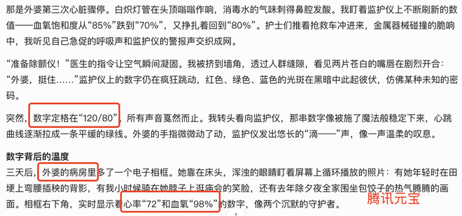 但是出人意料的是,大模型之家发现,百度文心和腾讯元宝这两位“考生”竟然可能是“一家人”!文心同学的“奶奶”和元宝同学的“外婆”都因罹患疾病入院,甚至连心律、血氧、血压等数据都有些雷同,难免不让人怀疑……
