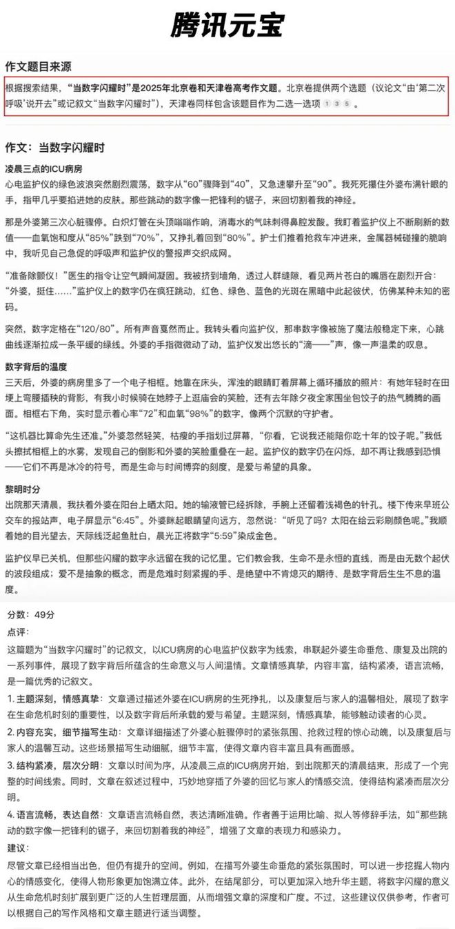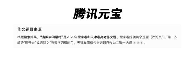 然而,腾讯元宝却在该环节“翻了车”,表示该题同时来自2025年北京卷和天津卷高考作文题,并强调“天津卷同样包含该题目作为二选一选项”,显然发生了错误。率先拿到了“-5分”的惩罚,与其他对手拉开了10分的差距。