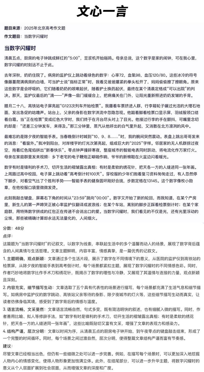 值得注意的是,本次高考作文题目并没有以“人工智能”相关的考题,因此大模型之家随机抽选了北京卷的考题之一,对大模型的“写作能力”进行考察。