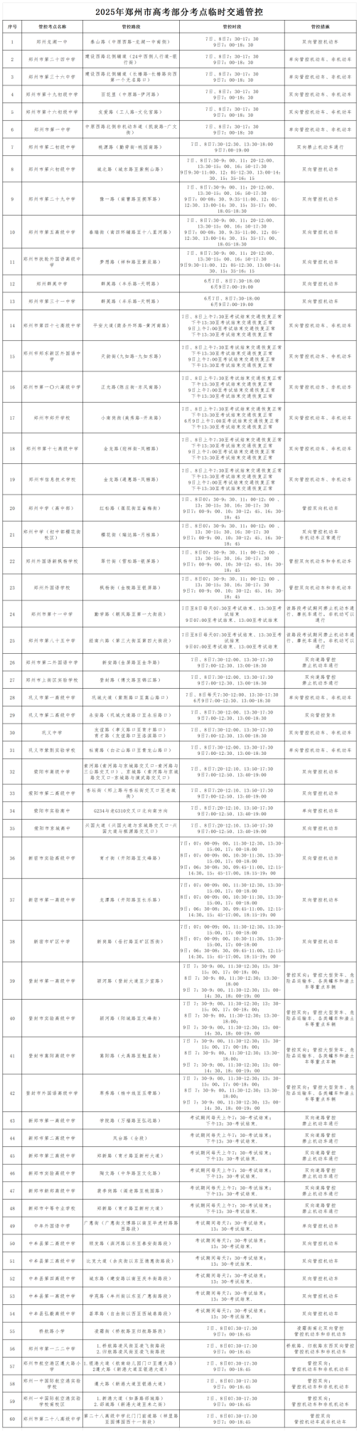 附:2025年高考郑州市60个考点临时交通管控信息