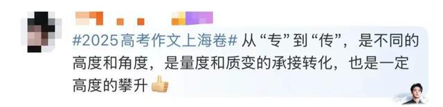 6月7日上午11:30,2025年全国高考的首场语文考试结束。今年上海的高考作文题由“专”“转”“传”三个字而来,提及有...