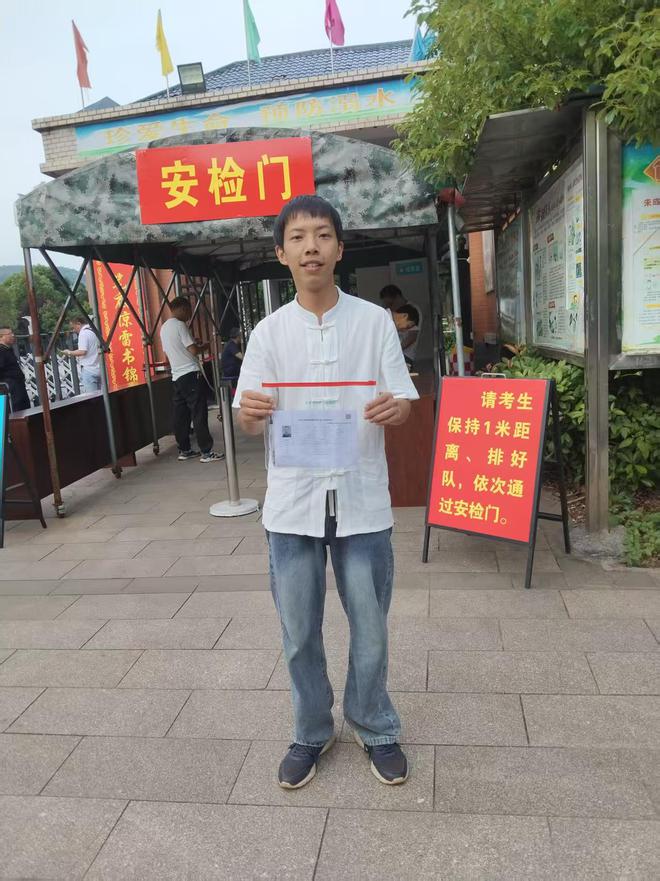“今天是高考的第二天,我上午考历史,下午要考英语。”小朱在考点外手持准考证拍照留念,“我让监考老师帮我拍了一个照片,我们这里天气挺好的,没下雨。”