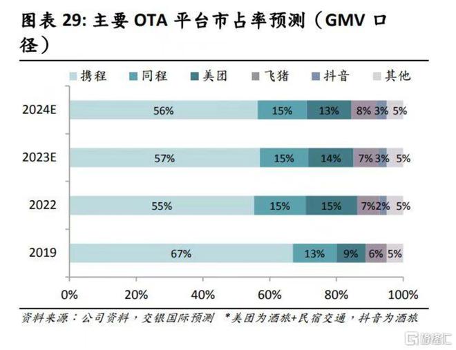 从整体市占率来看,交银国际预测2024年携程的市占率(GMV口径)将到达56%,领先于同程(15%)、美团(13%)、飞猪(8%)、抖音(3%)等众多对手。在收入规模上,携程是同程的3-4 倍,是美团的2-3 倍。